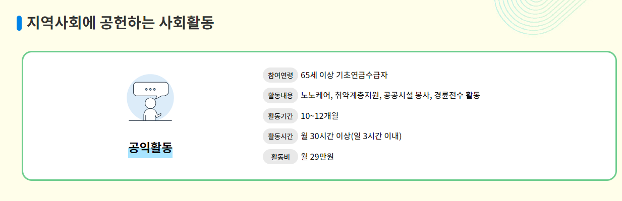 참여자는 공익활동, 사회서비스형, 시장형 등의 일자리 유형에 따라 활동하게 되며, 활동비를 지원받습니다.